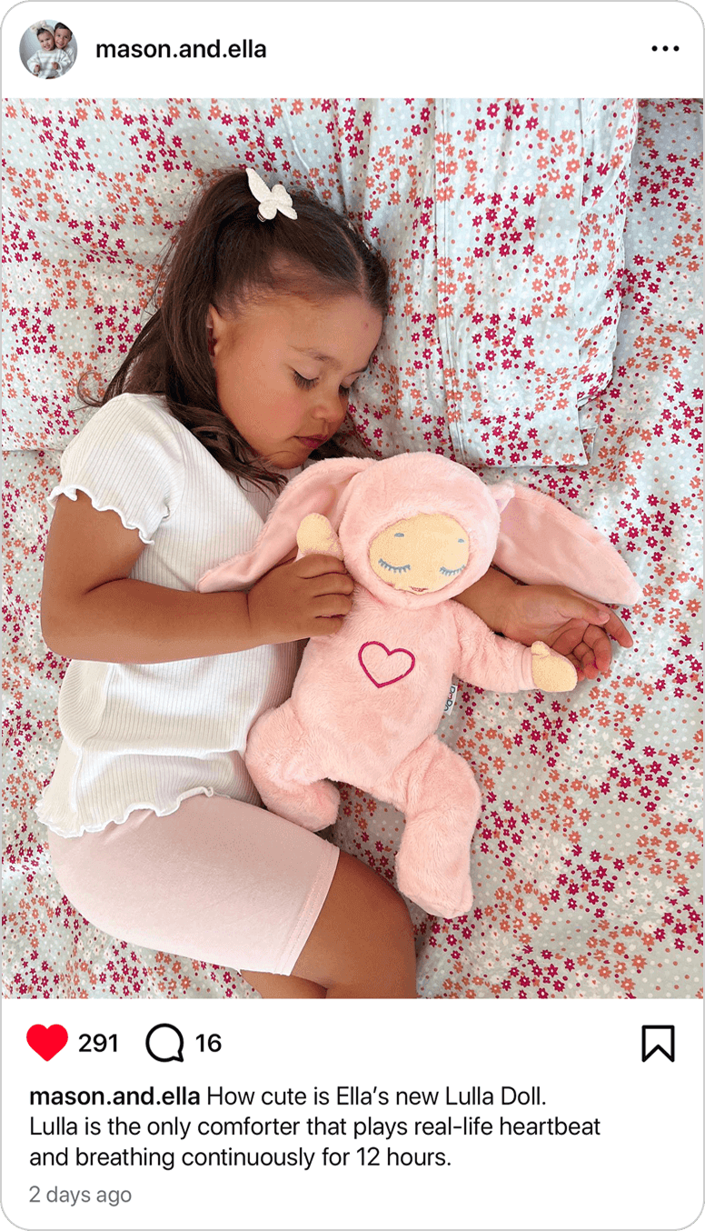 - Lulla is the only comforter on the market that plays real-life heartbeat and breathing continuously for 12 hours. Other popular sleep toys switch off after just 20 minutes.